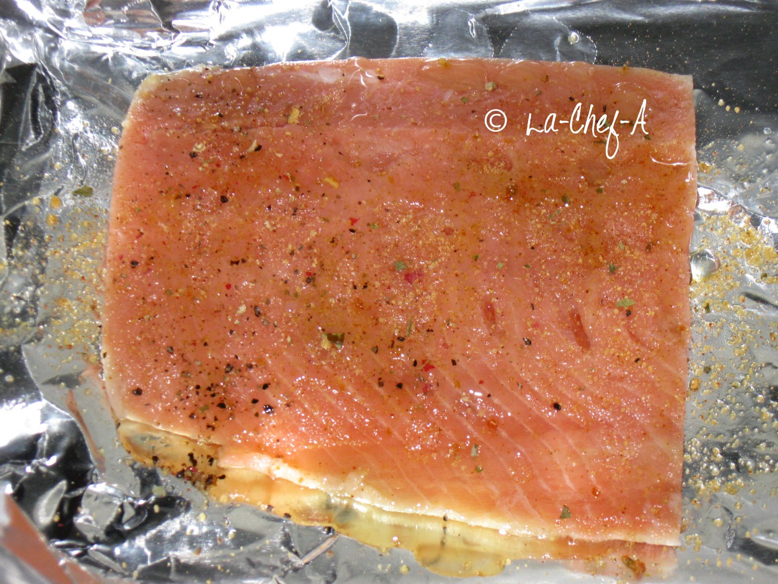 Se acopera cu o alta bucata de somon condimentat in prealabil si se stropeste cu putin ulei de masline si 1/4 pahar vin alb sec.